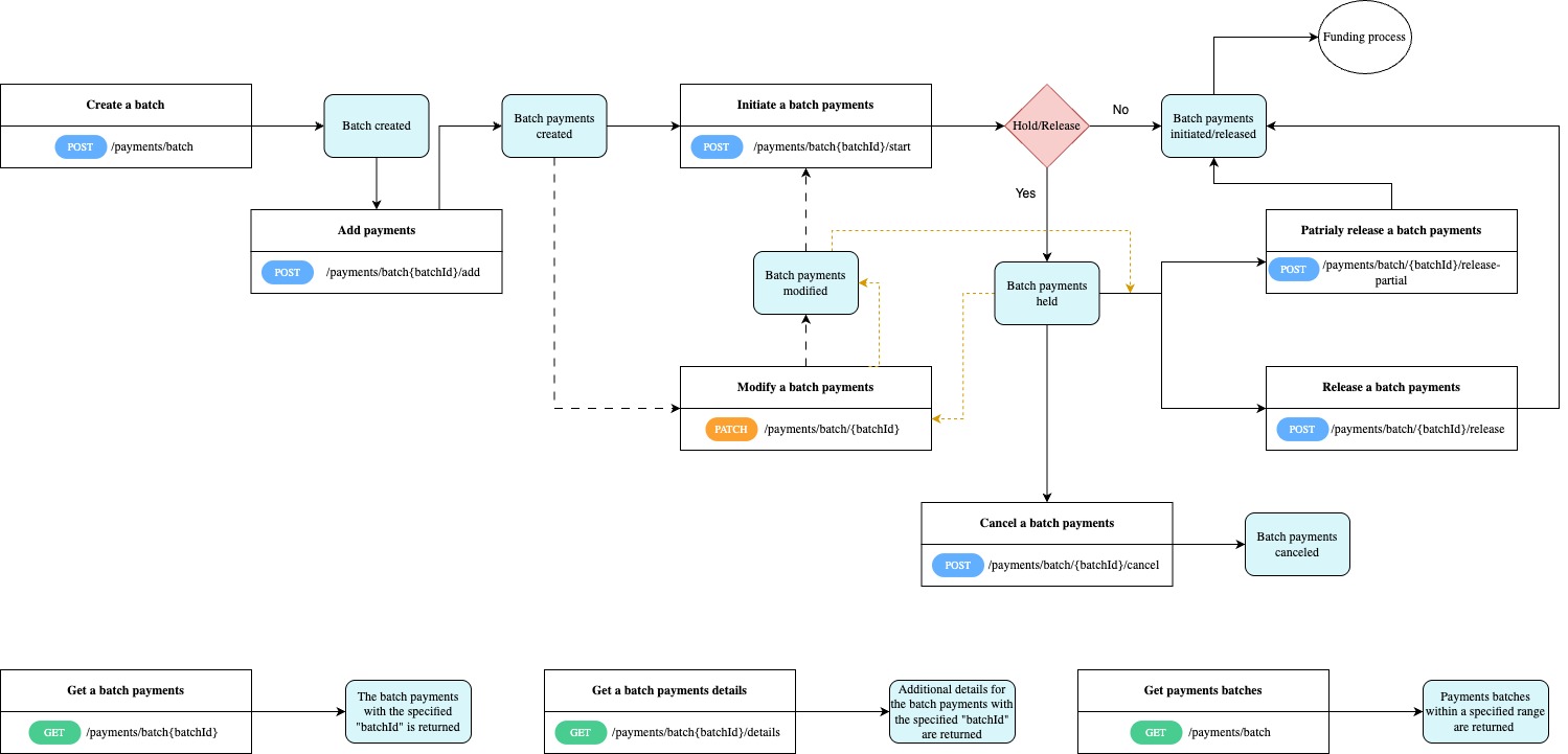 To initiate/release a held batch payment, send a POST request to /payments/batch/{batchId}/release. Once released, the payment batch enters to the funding process.